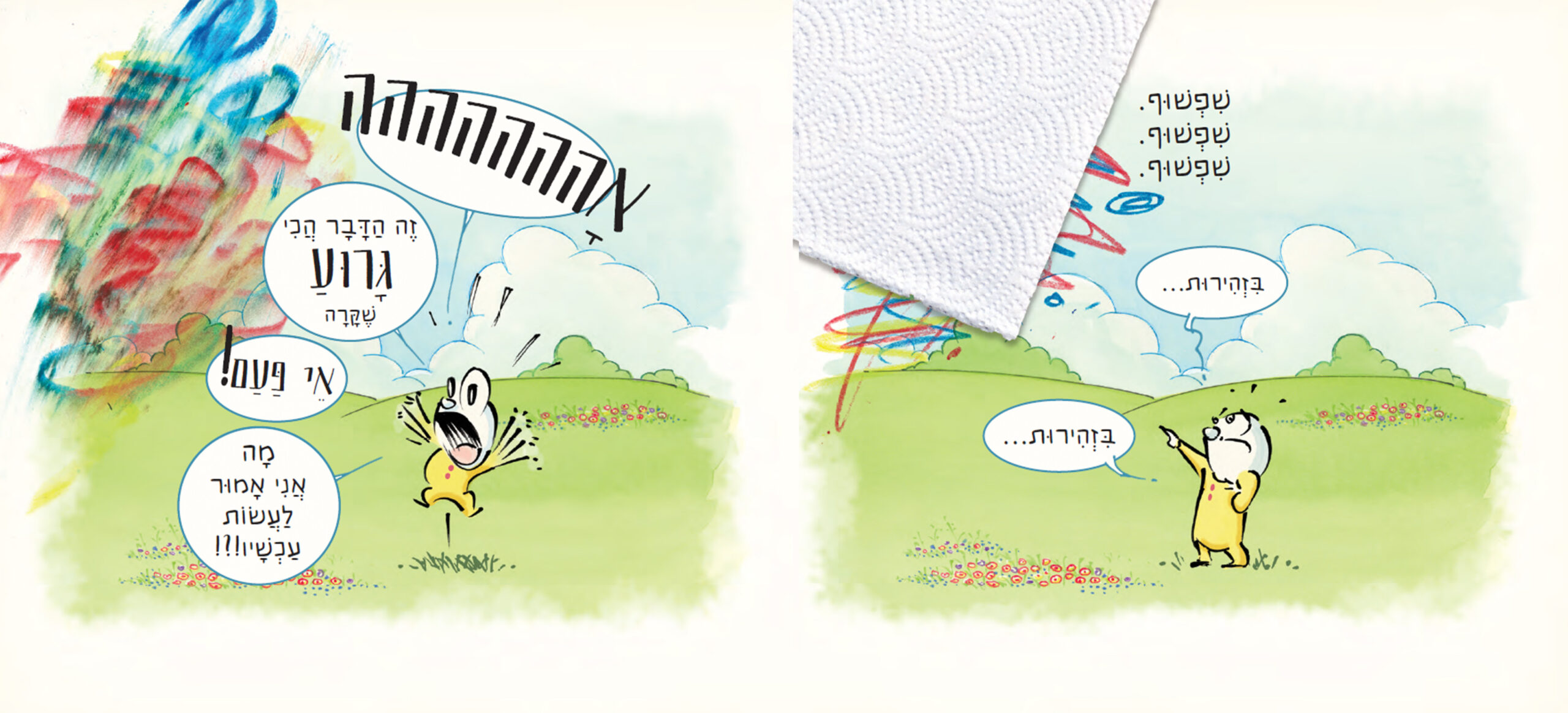 באמצעות הטקסט והקולאז' הוויזואלי נשבר ה"קיר הרביעי" של הסיפור. "הקיר הרביעי" הוא מושג מעולם התיאטרון, המתאר את המחיצה המדומיינת המפרידה בין הקהל לבין הבמה. מחיצה זו מסייעת לשחקנים להתרכז במלאכתם (כאילו אין קהל), ומאפשרת לקהל להתמסר לסיפור המוצג לפניו. במקרים שבהם השחקנים חודרים אל שורות הקהל, או כשהקהל מתבקש להתערב בהצגה, נשבר ה"קיר" החוצץ בין הבדיון למציאות והצופים חווים הֲזרה, המשפיעה על הרגשות ועל התובנות שלהם. בעשורים האחרונים חלחלה שבירת "הקיר הרביעי" גם אל ספרות הילדים לגיל הרך. על אף גילם הצעיר, הקוראים הצעירים מתבקשים להתערב בעלילה, לנקוט פעולה (למשל, להפוך את הספר) או להימנע ממנה (למשל, להפסיק לדפדף בספר), ובדרך זו הם ממלאים תפקיד חיוני בקידומה, ובהענקת חיים ומשמעות לסיפור.