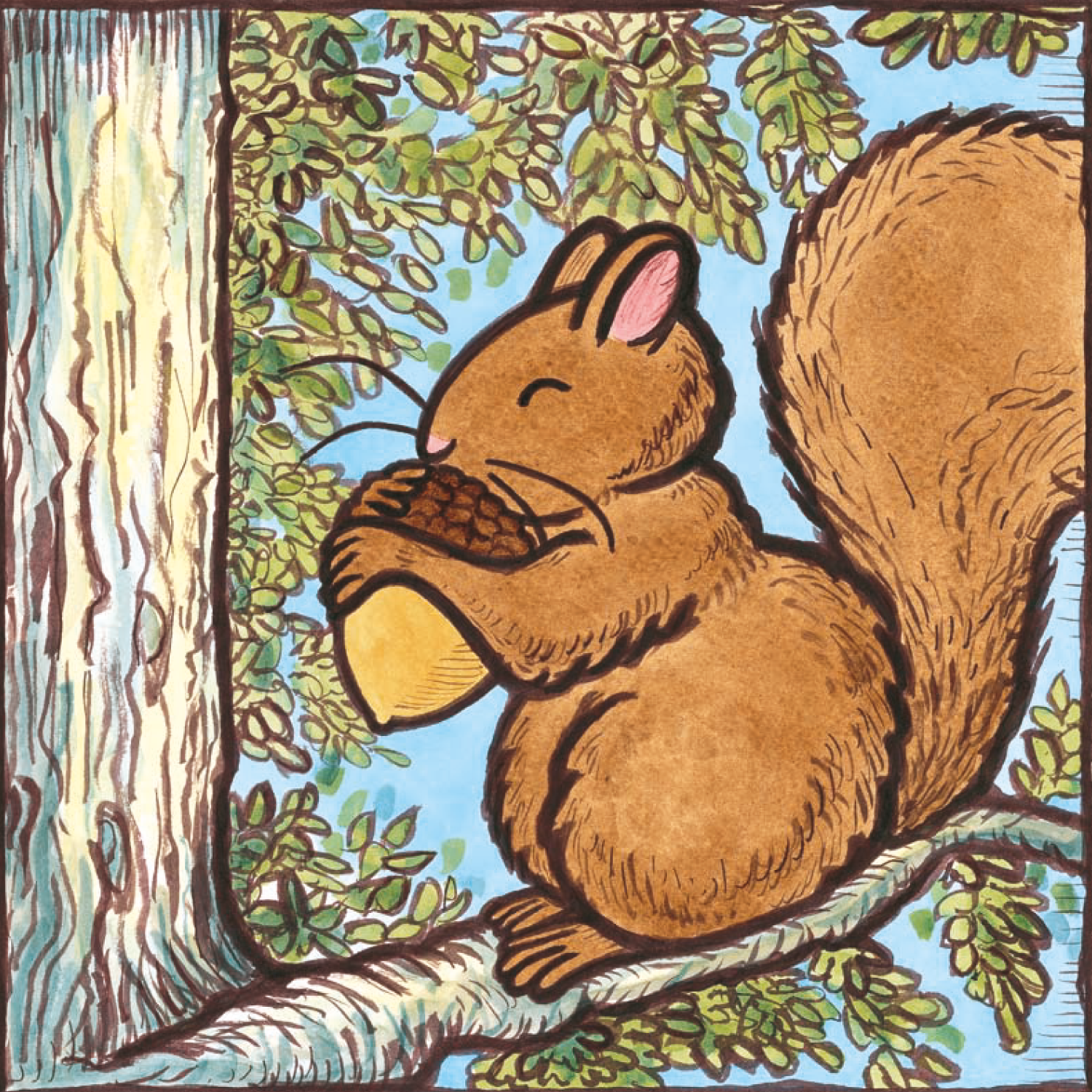 ציפור, כלבלב, שועל וסנאי פותחים את היום "ברגל שמאל": אחד מאבד את האגוז שלו, אחר מסתבך עם הרצועה ולציפור אובדת נוצה יקרה.